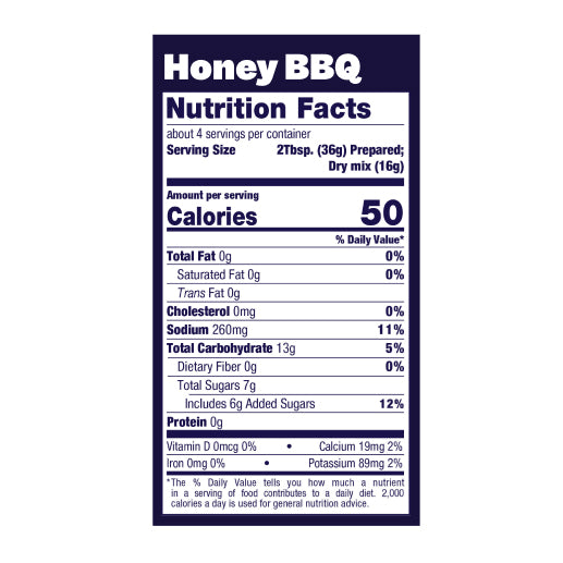 Brown Sugar, Vinegar Powder (Maltodextrin, White Distilled Vinegar, Modified Food Starch), Tomato Powder, Modified Food Starch, Salt, Black Malt Powder, Honey Powder (Maltodextrin, Honey), Spices (including Mustard), Onion Powder, Garlic Powder, Smoked Paprika, Hydrolyzed Corn Protein, Natural Smoke Flavor, Natural Flavors, Tricalcium Phosphate (Prevents Caking).
