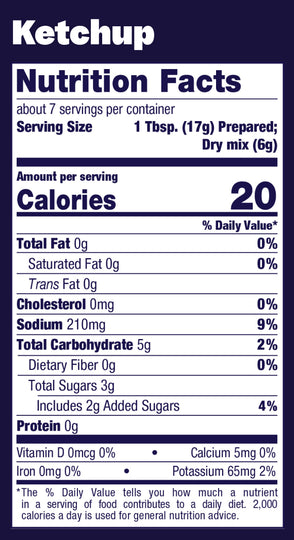 Classic Ketchup: Brown Sugar, Tomato Powder, Vinegar Powder (Maltodextrin, White Distilled Vinegar, Modified Food Starch), Salt, Modified Food Starch, Sodium Diacetate, Onion Powder, Garlic Powder, Hydrolyzed Corn Protein, Natural Flavor, Calcium Stearate (Prevents Caking). Chesapeake Fire Sauce: Cayenne Sauce Powder (Aged Cayenne Red Peppers, Vinegar, Salt, Garlic Powder, Maltodextrin), Sugar, Spices (Including Mustard), Modified Food Starch, Molasses Powder, Salt, Garlic Powder, Vinegar Powder (Maltodextrin, White Distilled Vinegar, Modified Food Starch), Honey Powder, (Maltodextrin, Honey), Paprika, Jalapeno Pepper, Paprika Extractive (Color), Natural Flavors, Xanthan Gum, Citric Acid, Calcium Stearate (Prevents Caking). Contains: Milk. Honey Hickory BBQ: Brown Sugar, Vinegar Powder (Maltodextrin, White Distilled Vinegar, Modified Food Starch), Tomato Powder, Modified Food Starch, Salt, Black Malt Powder, Honey Powder (Maltodextrin, Honey), Spices (including Mustard), Onion Powder, Garlic Powder, Smoked Paprika, Hydrolyzed Corn Protein, Natural Smoke Flavor, Natural Flavors, Tricalcium Phosphate (Prevents Caking).